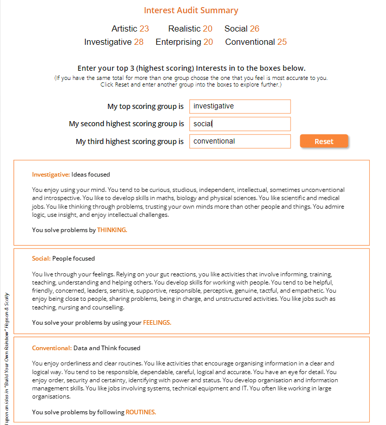 From the Interest Audit Summary you can see that my interests fit well with my skill assessment, my interests are well rounded with realistic and enterprising not being my biggest interests. My investigative and conventional interests are good for problem solving and developing in IT, while my Social interests help when it comes to working in a group with others. I am confident that the Interest Audit Summary is correct and reflects my Skills Assessment, and once I have finished my studies I hope to have improved on my skills, mainly skills that I may dislike.